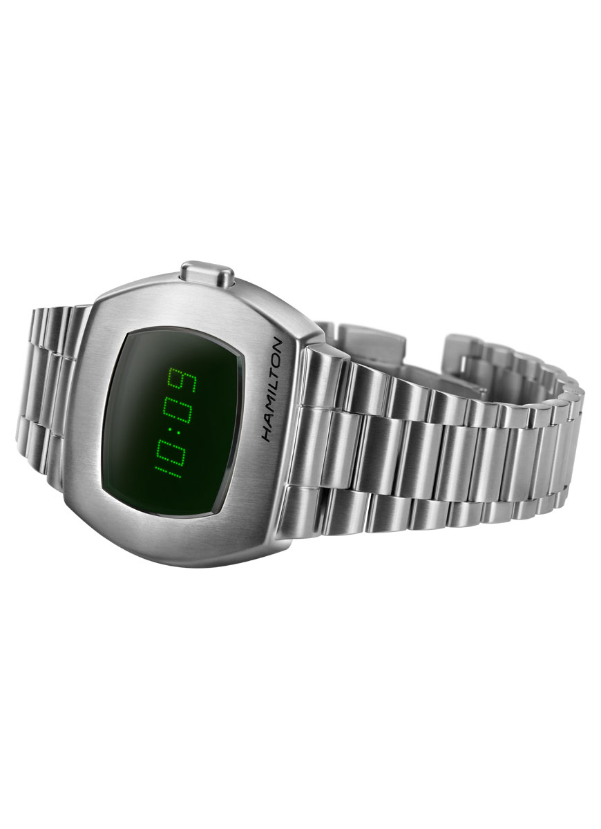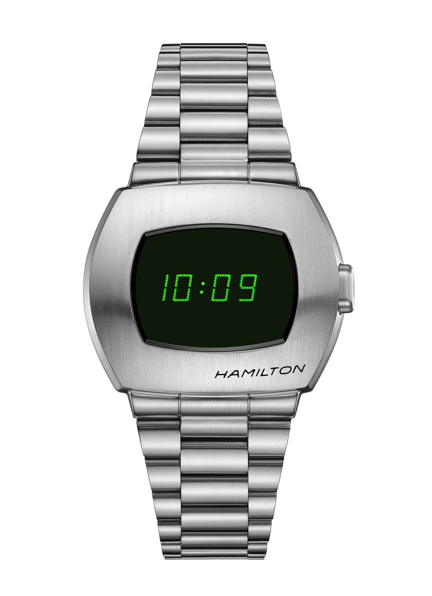 El icónico Hamilton PSR Digital Quartz supone una continuación de la historia de innovación que inauguró el primer reloj eléctrico del mundo en 1970. Con una pantalla digital híbrida que combina las tecnologías LCD y OLED, sus números verdes son fáciles de leer a simple vista durante el día y cuenta con un pulsador para mejorar la legibilidad durante la noche.
