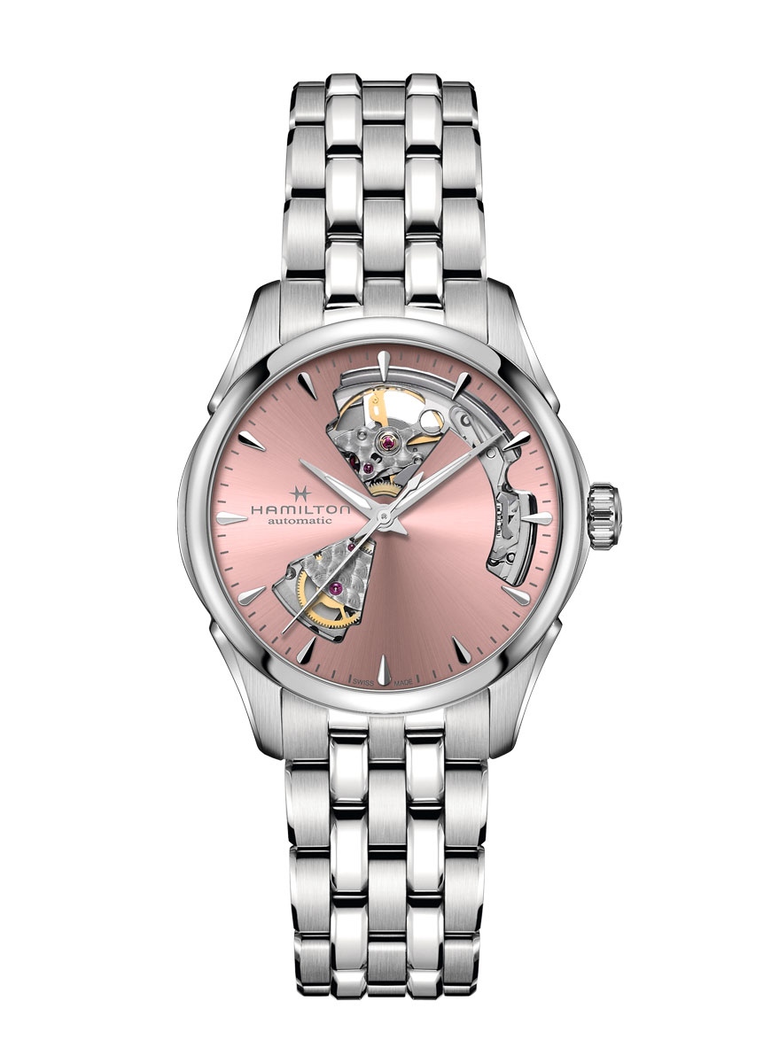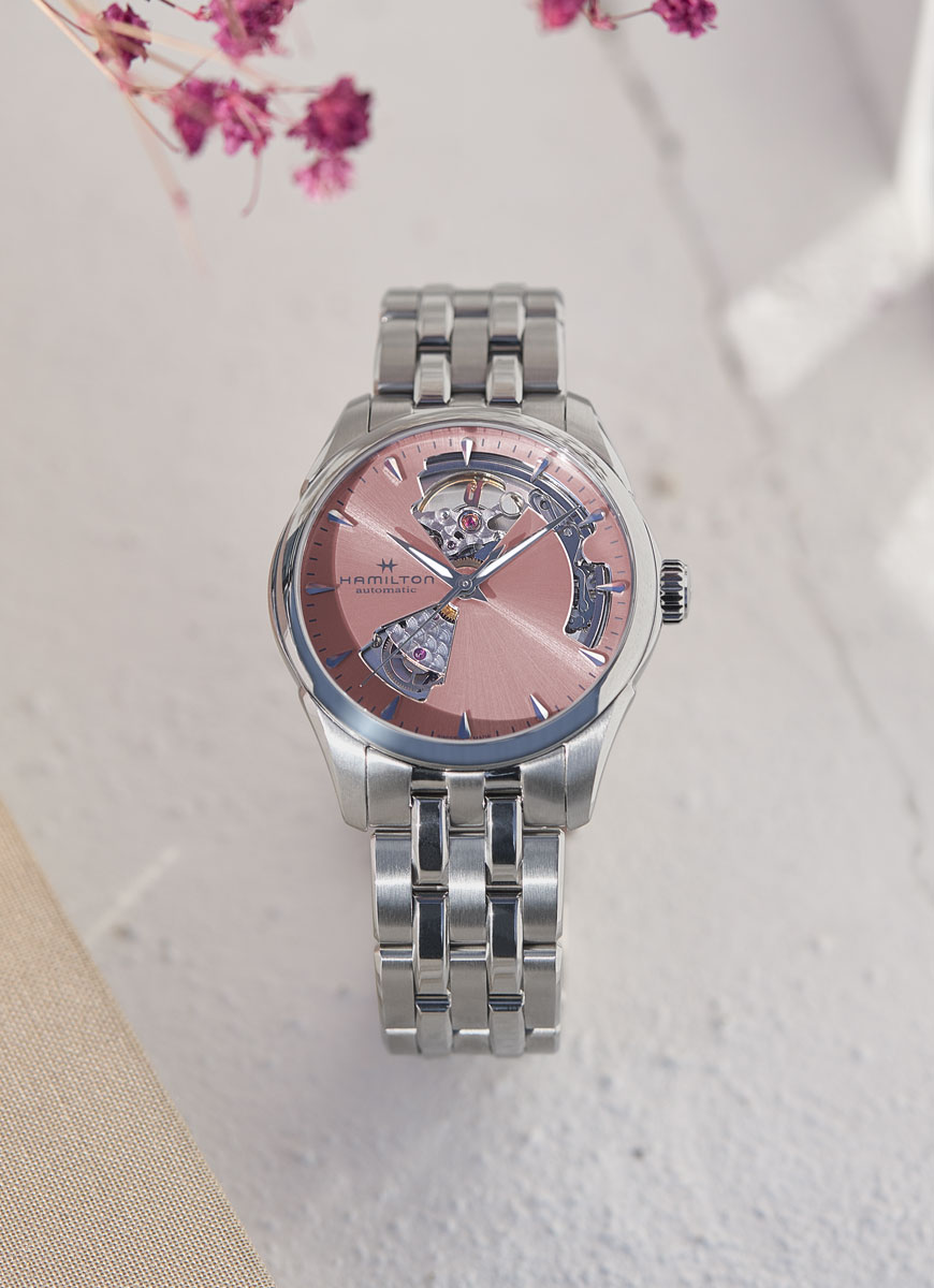 El Jazzmaster Open Heart de 36 mm demuestra un perfecto equilibrio entre aspecto clásico y artesanía innovadora. Esta versión de acero inoxidable, inspirada en el frescor de las flores al brotar, presenta una esfera con un diseño calado preciso que se adorna con un rosa sutil para ofrecer un estilo femenino y resplandeciente.