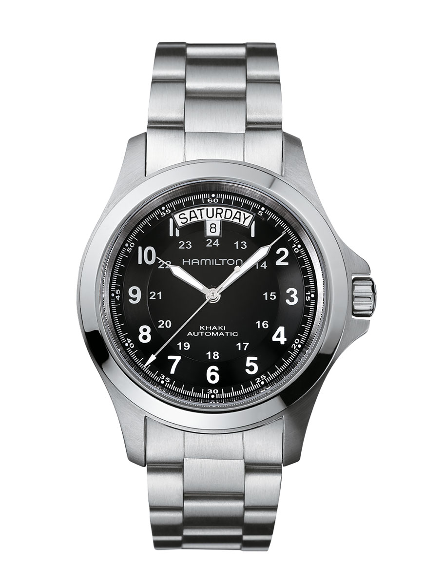 La hora militar predomina en la esfera del Khaki Field King Auto, demostrando claramente el legado militar de esta hermosa creación de Hamilton. Está equipado con protectores especialmente diseñados para garantizar la seguridad de la corona en cualquier circunstancia. ¡Larga vida al rey!